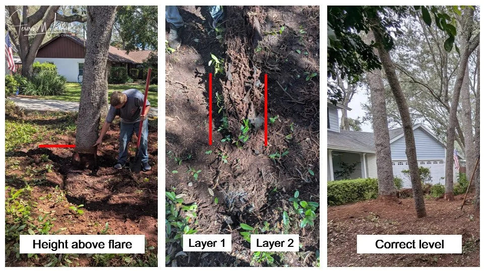 After consultations with professional arborists, one suggested solution was root collar excavation, which was extremely expensive but would not get rid of the saplings or the mulch mountain that had raised the bed up 2 feet above the front door sidewalk.